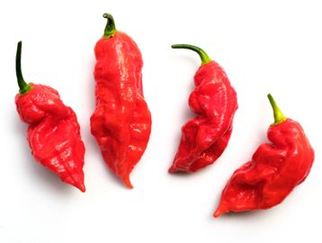 Originally from Southern California, this pepper features a fruity, citrusy flavor and a bright, fire-engine red color. It was developed in Walnut, California, by Frank Garcia of GNS Spices. The taste is often described as like a very spicy apricot. 350,000 to 570,000 SHU's